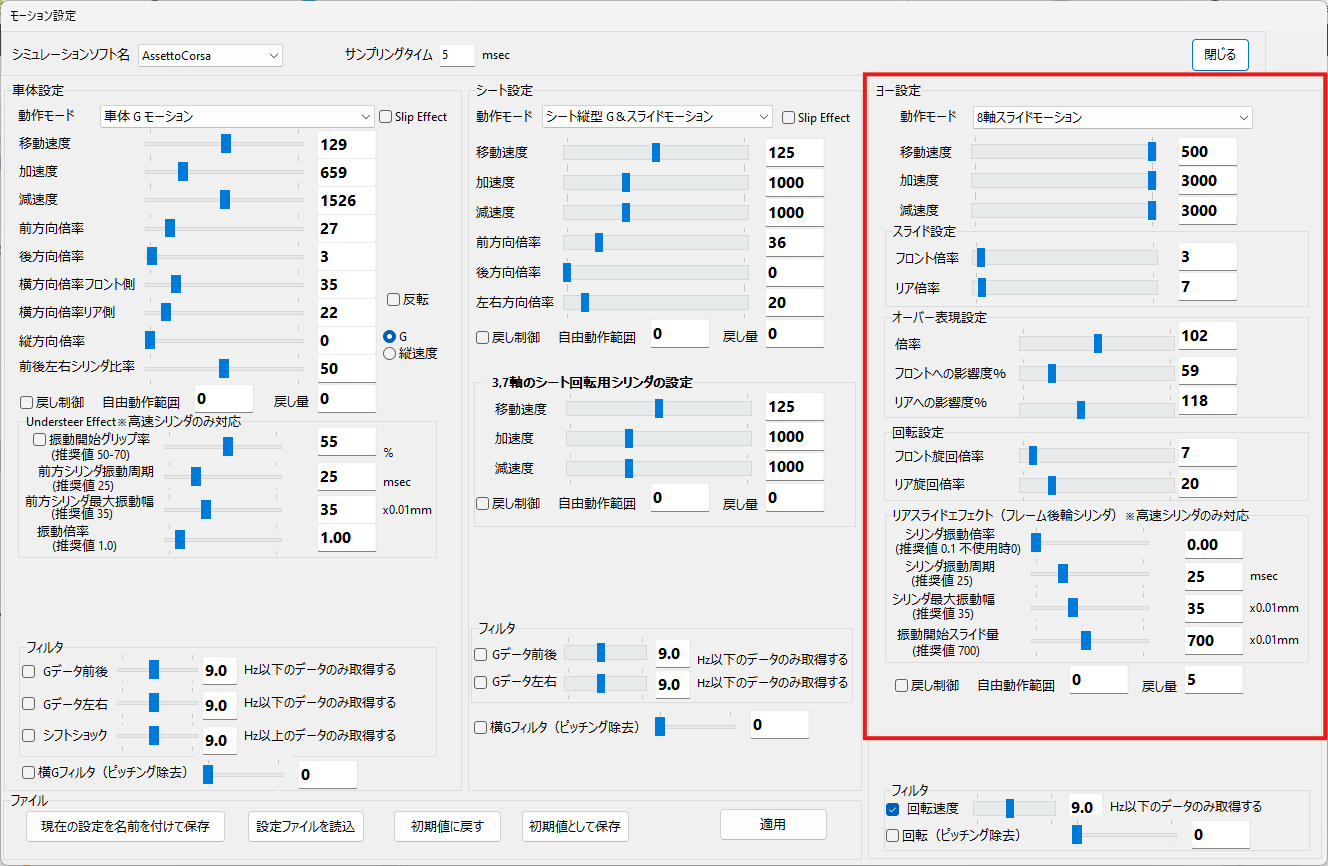 車両の横方向の後輪のスライド量のモーション動作量の設定です。